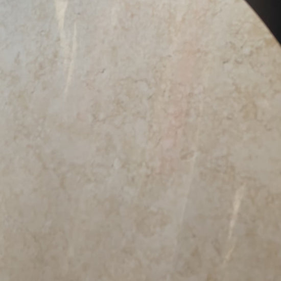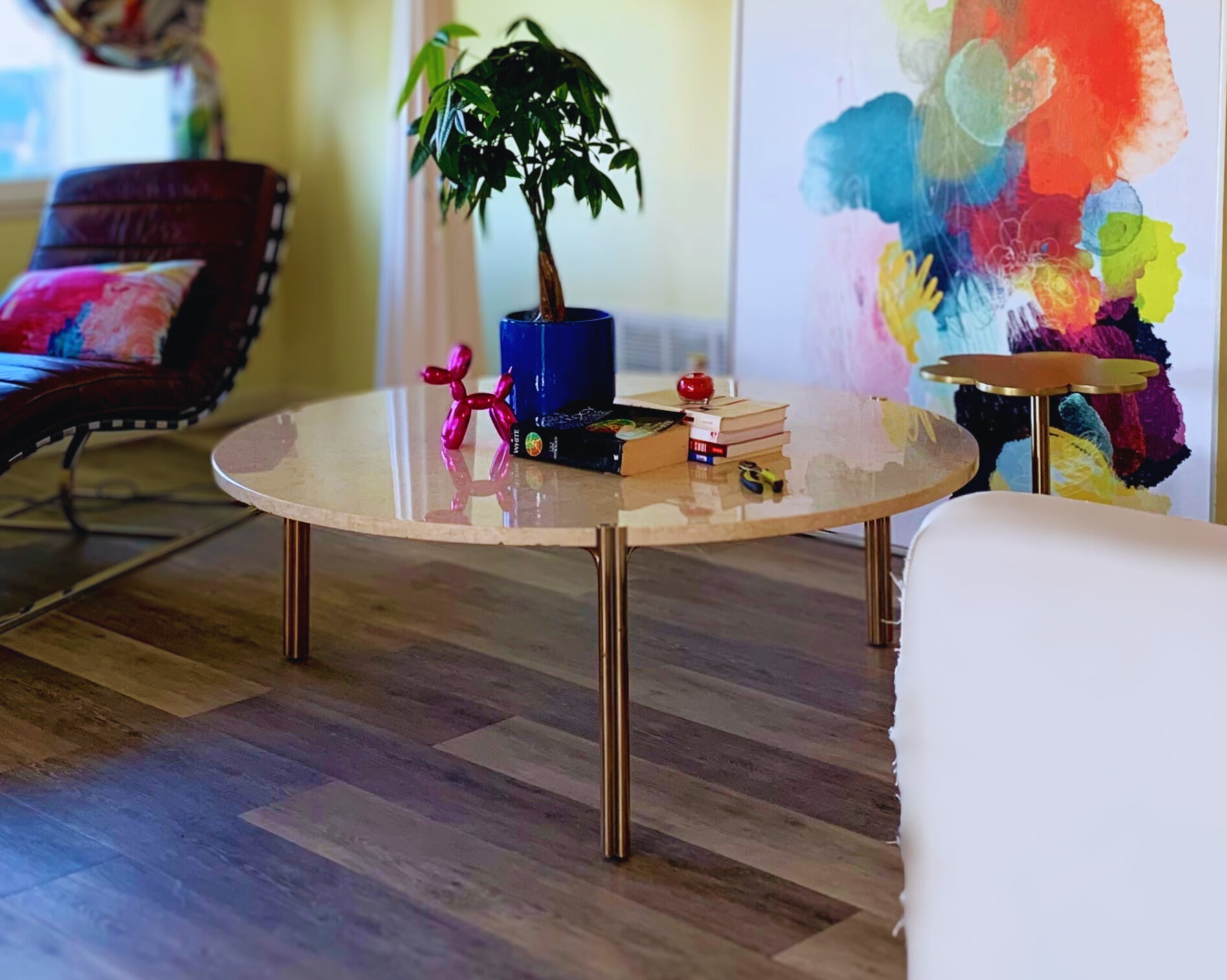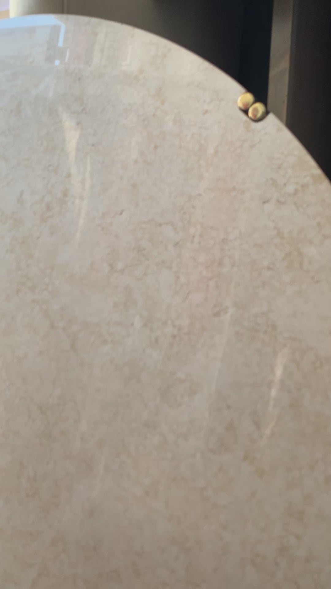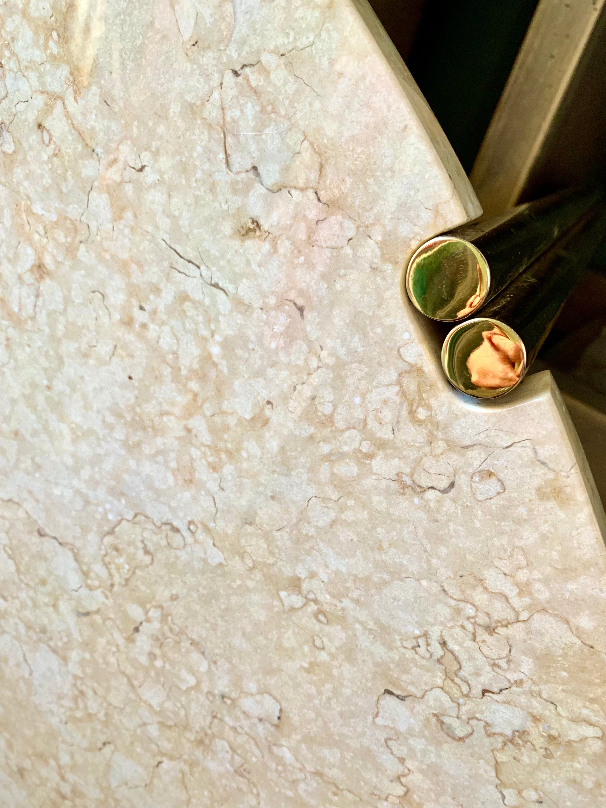 This is an eye-catching gem of a table. 4' round natural stone top with streamlined brass legs. Reminiscent of Art Deco glamour and beauty. This piece will steal the show in any environment.